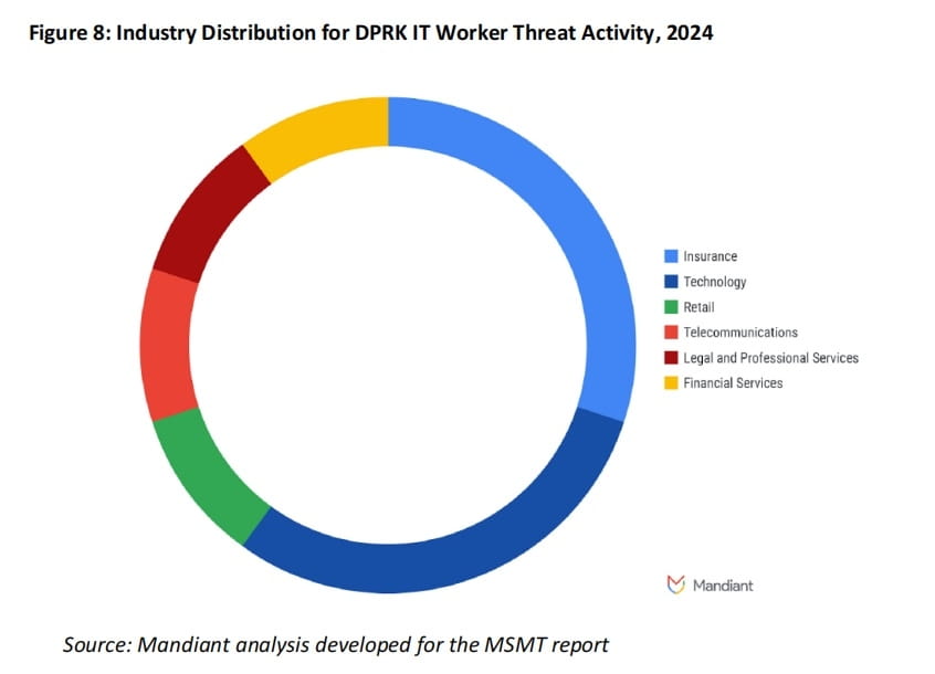 According to information collected by Mandiant for the MSMT report, DPRK IT workers operate globally, targeting industries including artificial intelligence, blockchain technology, website development, defense industry, government departments, and related research institutions. Some dismissed IT personnel have threatened to leak sensitive data from their former employers or provide it to competitors. This data includes proprietary information and source code for internal projects.