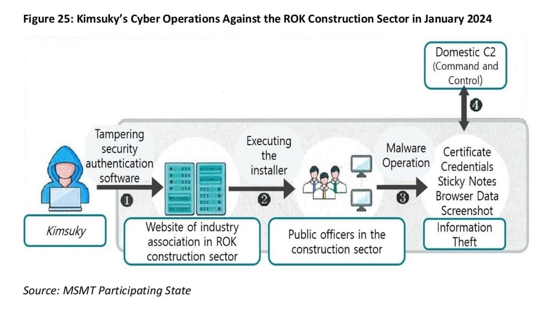 In January 2024, Kimsuky implanted the 'TrollAgent' malware on the South Korean Construction Industry Association's website, disguising it as a legitimate security certification tool, using stolen digital certificates to bypass detection. Through tampered documents, Kimsuky obtained user system information, browser data, screenshots, and login credentials. This data is believed to be used for further targeted attacks against South Korean public officials and major construction projects.