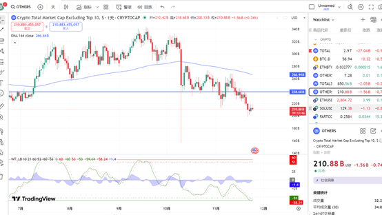 Daily chart of the total market cap of altcoins excluding the top 10 by market cap, showing a downtrend, with weak rebounds.