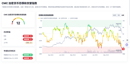 Fear and Greed Index 12, Extreme Fear, yesterday was 10, refreshing the lowest value in years.