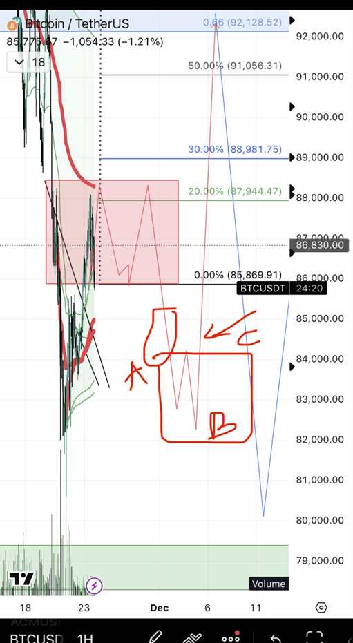 I think we may first slightly drop to the 84k–85k range to fill the CME gap, and then conduct a bearish retest in the 92k area.