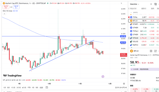 BTC.D Bitcoin's market cap accounts for 58.95%. The downtrend indicates BTC is weaker than mainstream altcoins.