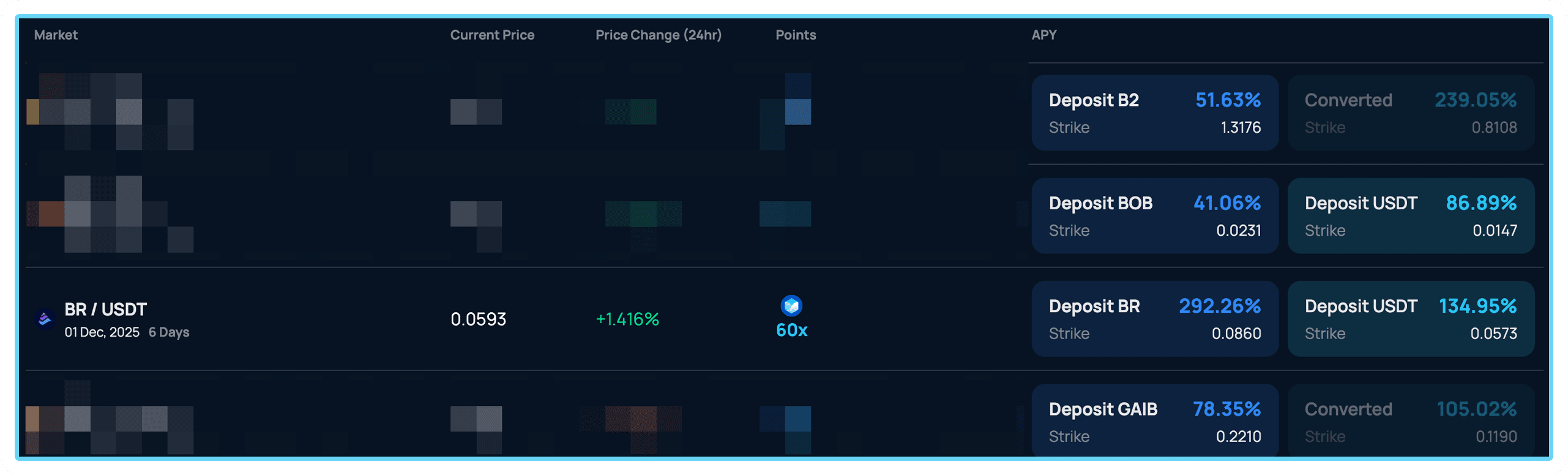 2/ Deposit USDT: After maturity, if the token price < Strike price, then you will buy the token and earn APR during this period (which may incur losses); otherwise, you will earn APR and retain USDT. The risk is that the bought token may continue to decline, leading to a reduction in principal.