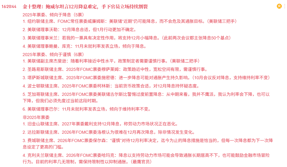 In the short term, the divergence leads to repeated expectations for rate cuts, and cryptocurrency prices will fluctuate back and forth. It’s not clearly bullish or bearish, more of a 'market oscillation under emotional pull' lacking further certainty. If ultimately there is a rate cut in December (currently there’s a probability), it would basically be a clear bullish signal for liquidity easing supporting cryptocurrency prices.