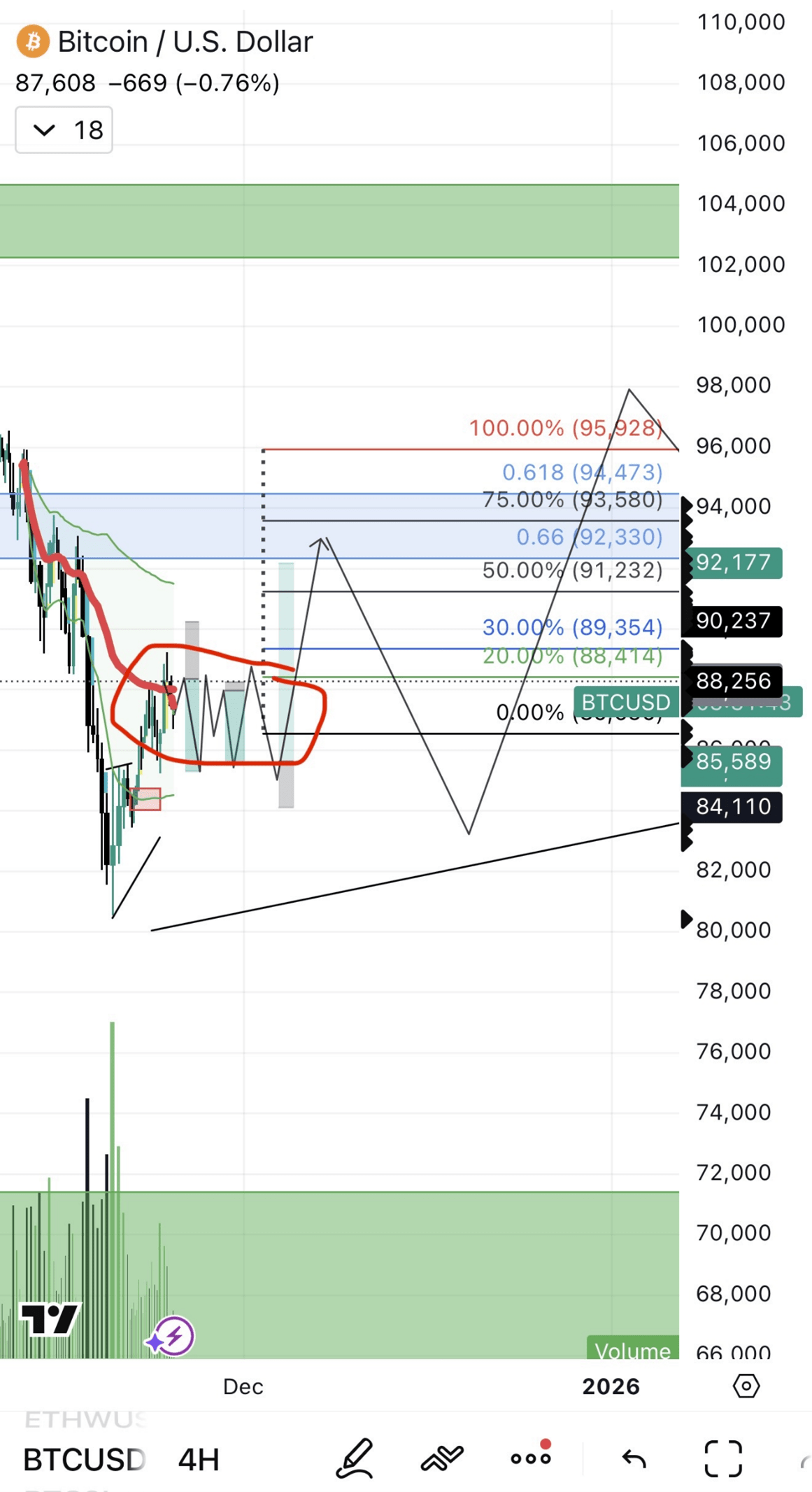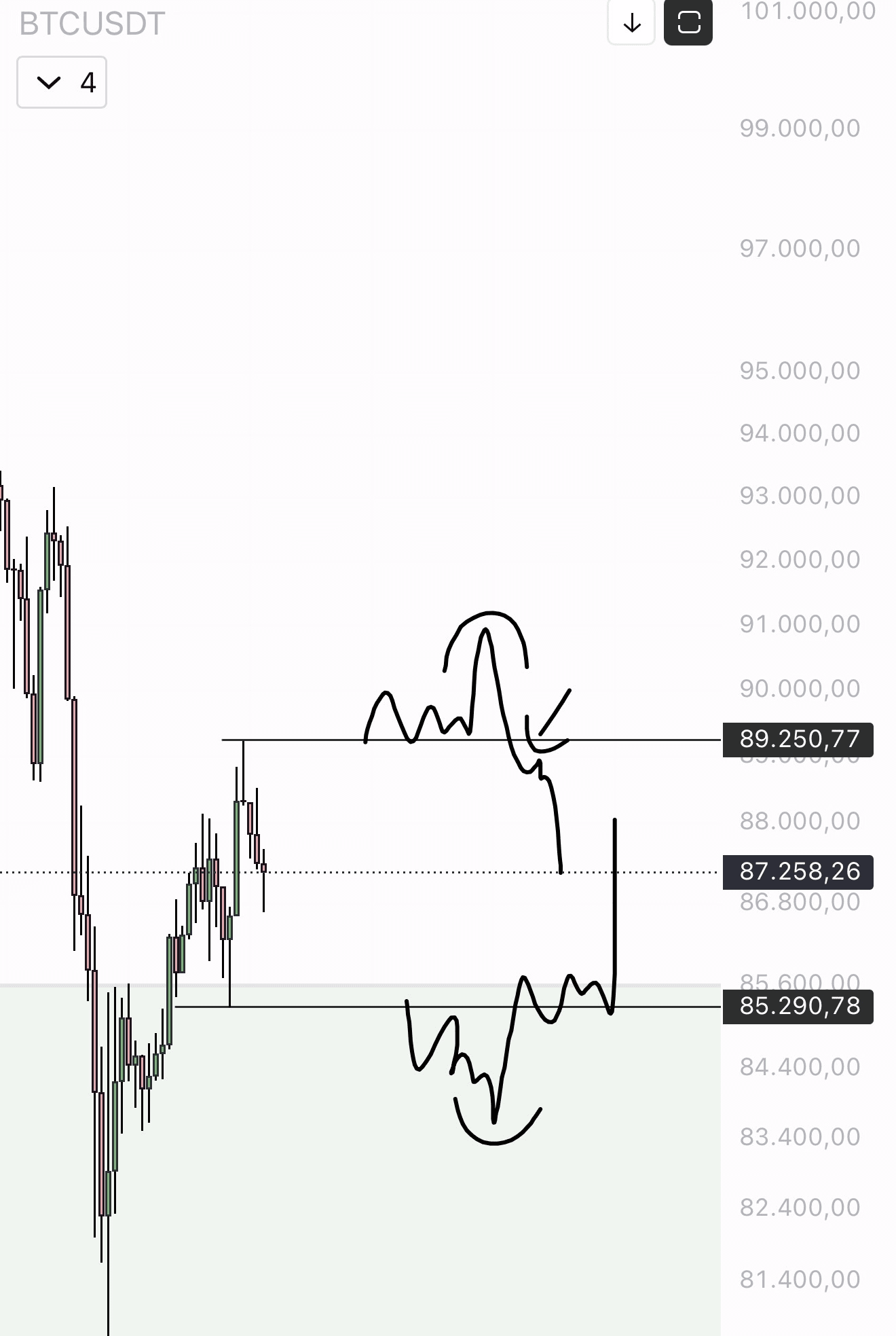 (Eliz plans to short around 89K or go long around 83K.)