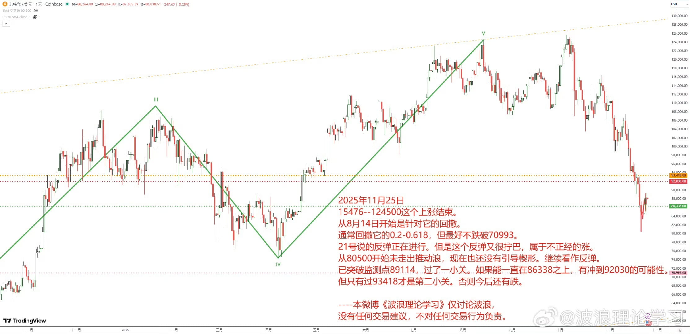 The rebound mentioned on the 21st is ongoing. However, this rebound is very twisted and belongs to an irregular rise. Since starting from 80500, it has not formed a leading wave, and it still has not formed a guiding shape. It continues to be regarded as a rebound that has broken the monitoring point 89114, which has passed a small level. If it can stay above 86338, there is a possibility of reaching 92030, but only breaking above 93418 is the second small level. Otherwise, there will be further declines in the future.