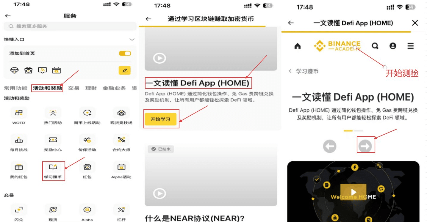 Binance's learning to earn crypto task, rewards 50 $HOME😍, let's get started together!! Here are the detailed steps: 1. Click on Activities and Rewards 2. Learn to earn crypto 3. Find the HOME activity 4. Start learning 5. Remember to click the arrow on the right 6. The quiz starts in the upper right corner, begin answering questions and follow along with the image explanation step by step😘😘😀