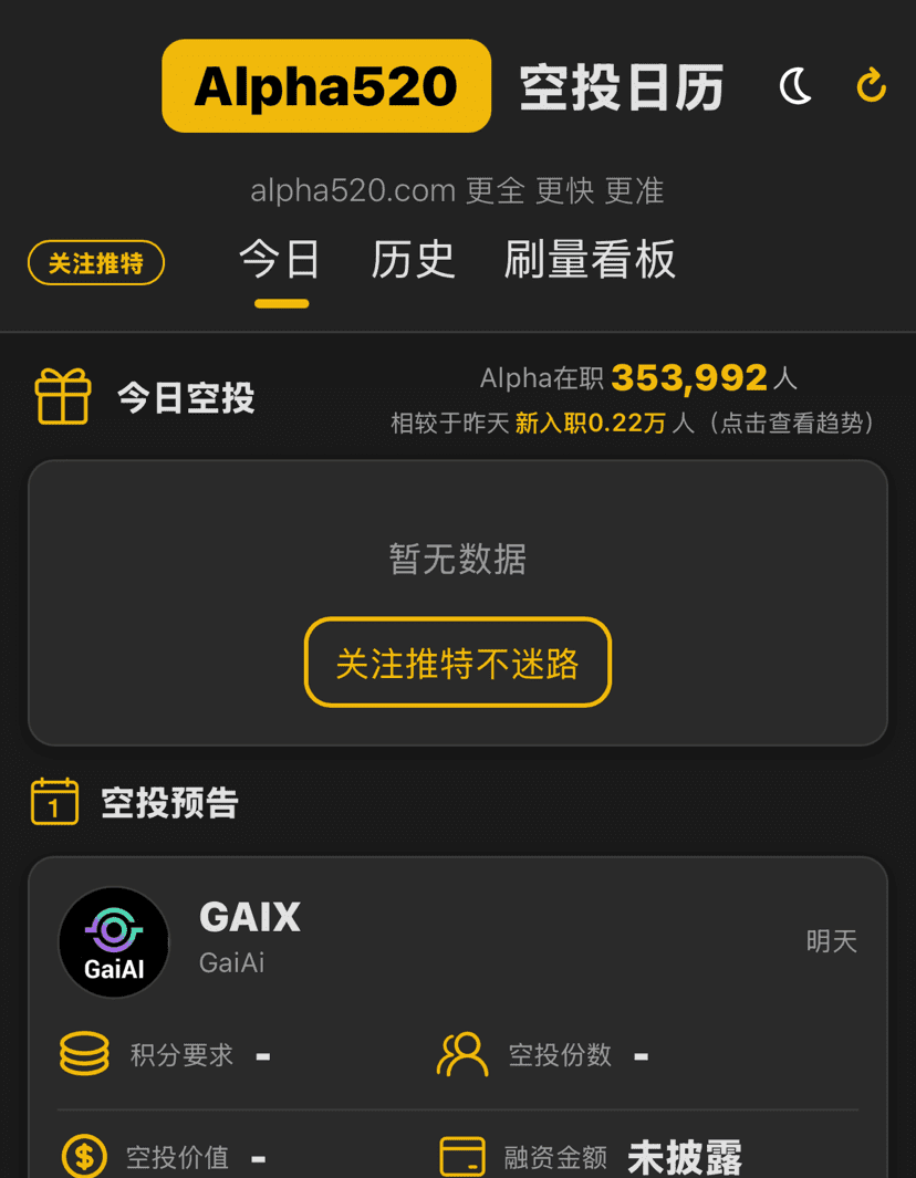The current airdrop market is troubling: it is difficult to predict big airdrops (high-value airdrops), but fortunately, their claiming rhythm is slow, giving users time to verify their value; however, it has been continuously small airdrops (low-value airdrops) recently, and waiting for big airdrops for a long time can easily lead to missed opportunities. Fortunately, my points will be in place tomorrow, allowing me to participate in GAIX claiming, and I hope it can replicate the high-value performance of yesterday's GUA.