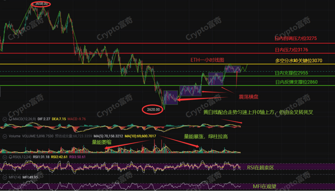 From the 1-hour K-line view, it has risen from the low of 2620 to 3070, experiencing three horizontal fluctuations between 2620-2860, 2860-2955, and 2955-3070, indicating that the bulls are accumulating power in a step-by-step manner! The current price is repeatedly testing around the critical point of 3070; once it stabilizes here, the next target will be the resistance level of 3176! But beware of the MACD signaling a death cross above the 0 axis, with volume occasionally shrinking and then surging, indicating intense competition between bulls and bears! Although the RSI is in the oversold zone, the MFI shows a strong wait-and-see sentiment, suggesting there might still be a pullback risk in the short term!
