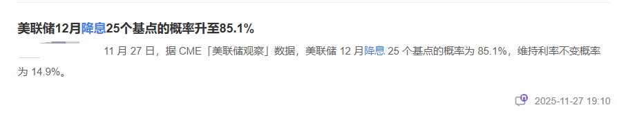 Breaking news: The probability of the Federal Reserve cutting interest rates in December has surged to 85.1%! This is a super signal for global capital flowing into risk assets! Historical experience shows that under expectations of interest rate cuts, Bitcoin and Ethereum often surge first! Especially with ETH recently rebounding from a low with increased volume, it is clear that large funds are positioning themselves in advance, creating a resonance between news and technical analysis, and the potential for explosive growth in the future may exceed expectations!