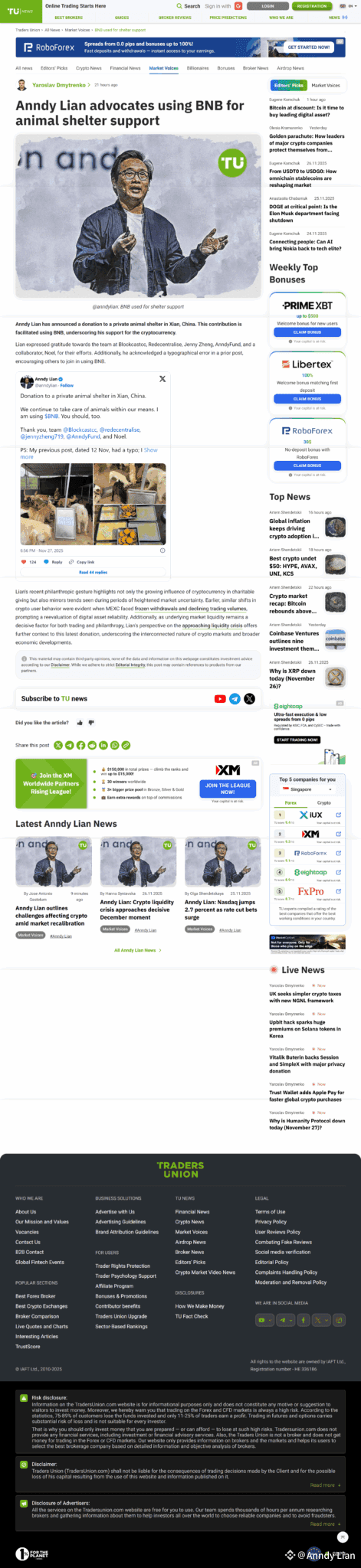 Anndy Lian has announced a donation to a private animal shelter in Xian, China. This contribution is facilitated using BNB, underscoring his support for the cryptocurrency.