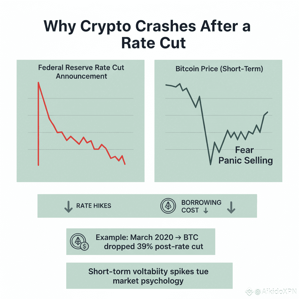 Short-term fear: A rate cut signals economic weakness, triggering panic selling even though long-term liquidity improves.
