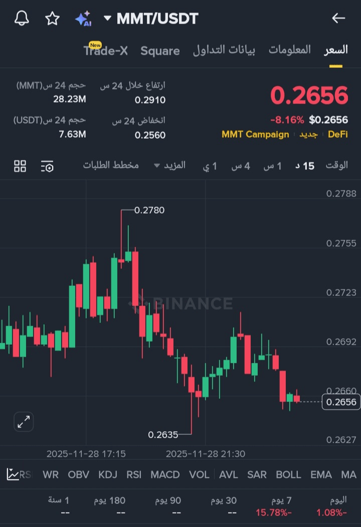 The MMT currency is experiencing noticeable selling pressure over the past few hours, driving it down to the level of $0.2656 after a decline of 8.16%, placing it now in a sensitive area that could be the next starting point or a continuation of the correction. Despite the drop, the chart shows signs of a potential rebound and hidden buying strength preparing to emerge.