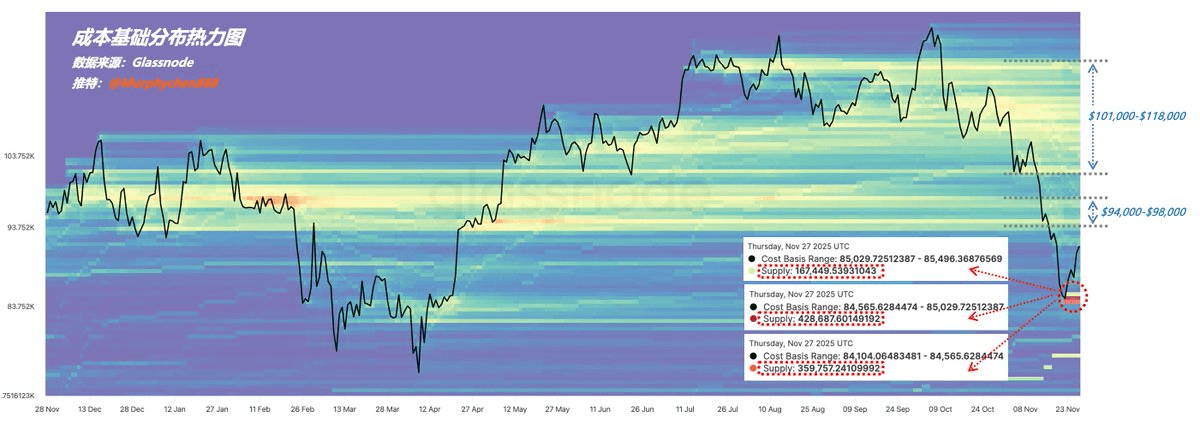 On this data, the most striking point is the sudden appearance of 'red' data bars around 84,000-85,000, indicating a significant accumulation of chips here. To make it easier for everyone to view, I have extracted it. The three positions combined accumulated a total of 950,000 BTC; the appearance time was during the days of 11/21-11/23.