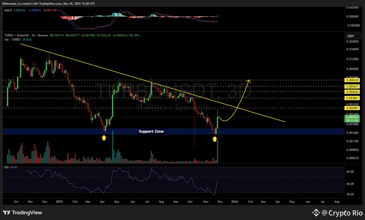 I can see on $TURBO a clear price action that has perfectly respected the major support zone with significant volume on the 3-day timeframe. The Relative Strength Index (RSI) is showing clear potential for an upward momentum shift. A decisive move above the descending resistance line will confirm the breakout for trend continuation higher.