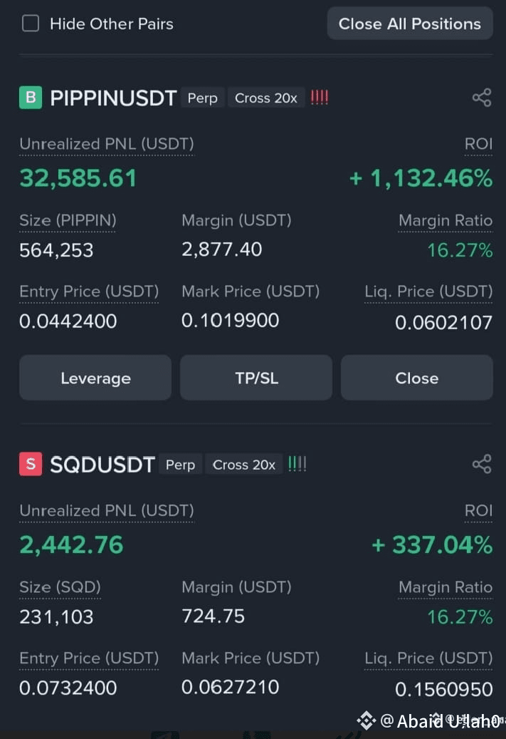 · Liquidation Risk: The liquidation price is 0.06021. This means if the price of PIPPIN falls by approximately 41% from its current level, the position will be automatically liquidated, wiping out the entire margin of 2,877.40 USDT.