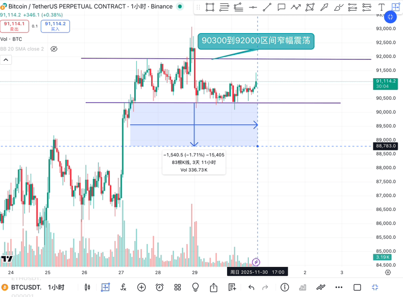 The weekend is still the same as usual, a narrow range of fluctuations, suitable for short-term players. This weekend I will shorten my time at the top of the market, occasionally check the news, or glance at the markets, but more time will still return to my own life, so that on Monday I can have a better mindset and mood to watch the market. A good mindset can definitely improve your win rate. I looked at the fundamentals, and there was a negative news yesterday, which is that the mainland has further cracked down on the crypto market, this time it clearly stated that stablecoins are a type of virtual currency, which was previously not clearly categorized as virtual currency. Although it is bad news, it hasn't had much impact on the market, perhaps everyone has become less sensitive to such news, after all, we have experienced a lot. There is currently another piece of news, which is that Federal Reserve Chairman Powell will resign on December 1, and the meeting will be at 7 PM (Eastern Time) on Monday. This news's authenticity cannot be verified yet, but if the news is true, it would be a positive for the crypto community. Such news will have market implications, everyone pay attention!