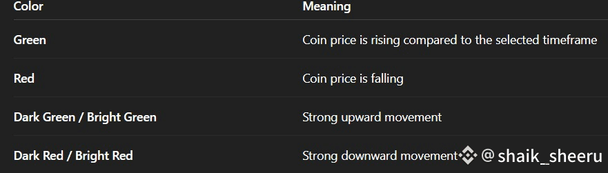 Some coins show bright red or bright green colors. These are usually very volatile — prices move up or down very fast.