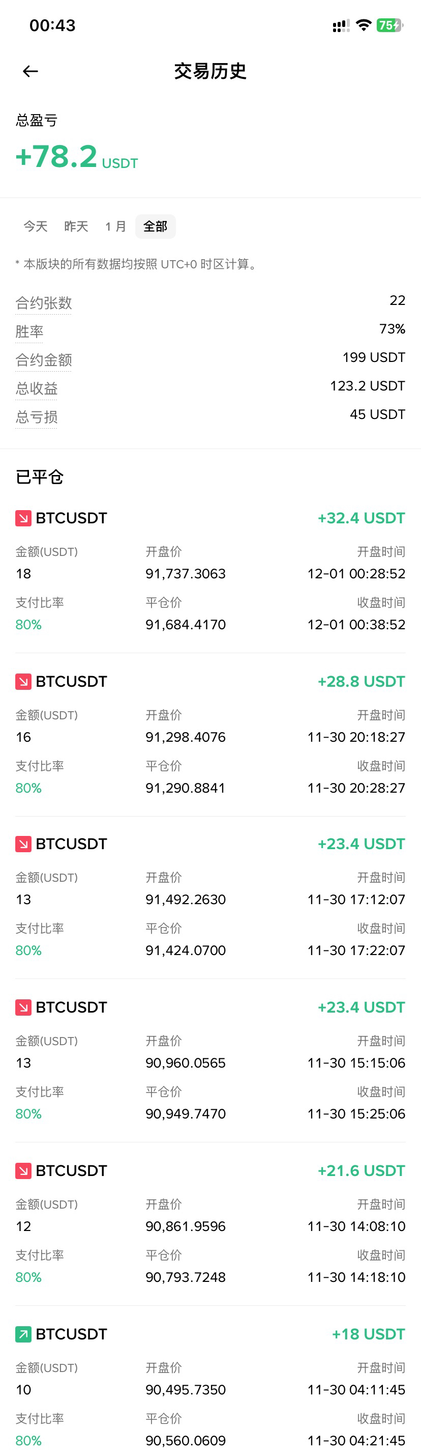 The day before yesterday, I excitedly put in 10u, but it wasn't particularly ideal. Since yesterday, it's slowly getting better. I think playing event contracts requires patience. Finding a good entry point is very important. Today, I only opened six times, and it was also a sweet six consecutive wins. Although the earnings weren't much, the stability is what matters. I've never felt that playing contracts is gambling; I feel like I’m just riding the wave of the trend.