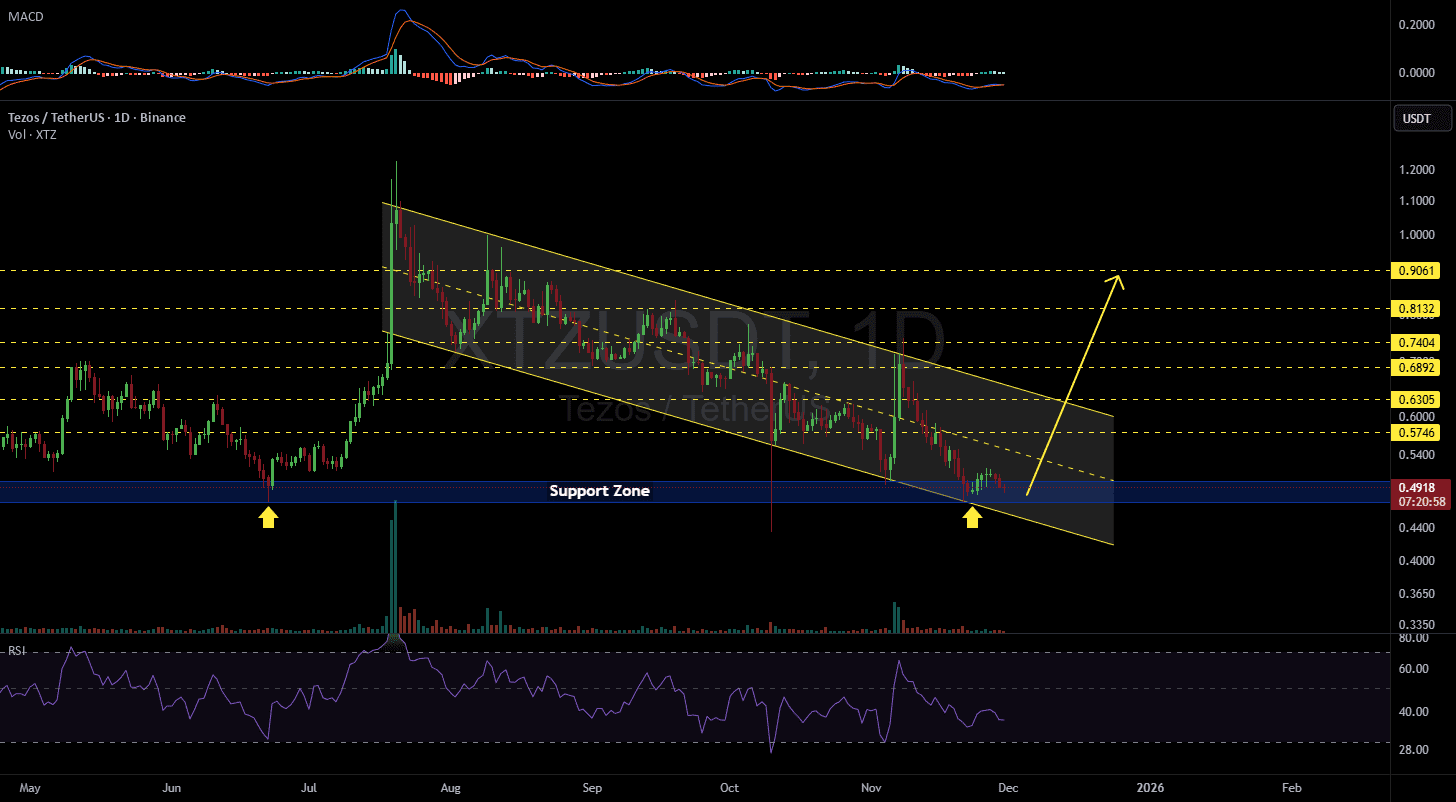 #XTZ It is moving within a descending channel on the daily timeframe and is currently sitting at a support area. For the bullish scenario, it must bounce from this area with strong volume. Do not enter here yet - the volume is weak, and the relative strength index indicates that there is still room for further decline. If a successful bounce occurs, we can look for the next short-term targets: