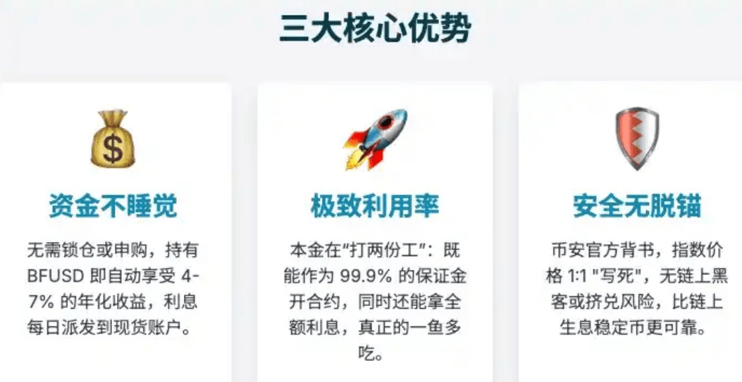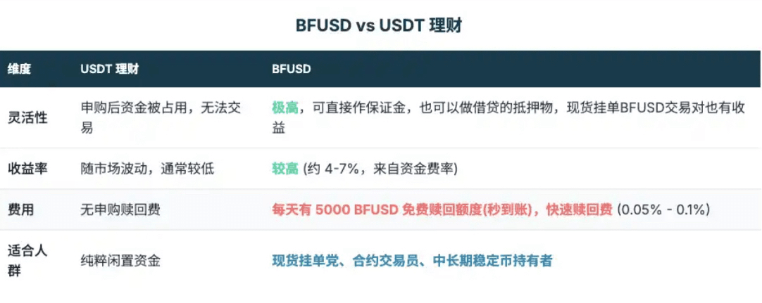 Therefore, from an asset allocation perspective, BFUSD can play three key roles in fund management strategy: it can act as a defensive layer to stabilize portfolio risks in high volatility ranges; it is a liquidity reserve that can be reallocated at any time to capture arbitrage or trend opportunities; it is also an important income barrier, providing additional returns through capital-protected financing to effectively increase overall investment returns. It gives traders a new philosophy for fund management: "holding, open positions, borrowing, and earning interest," all without delay.