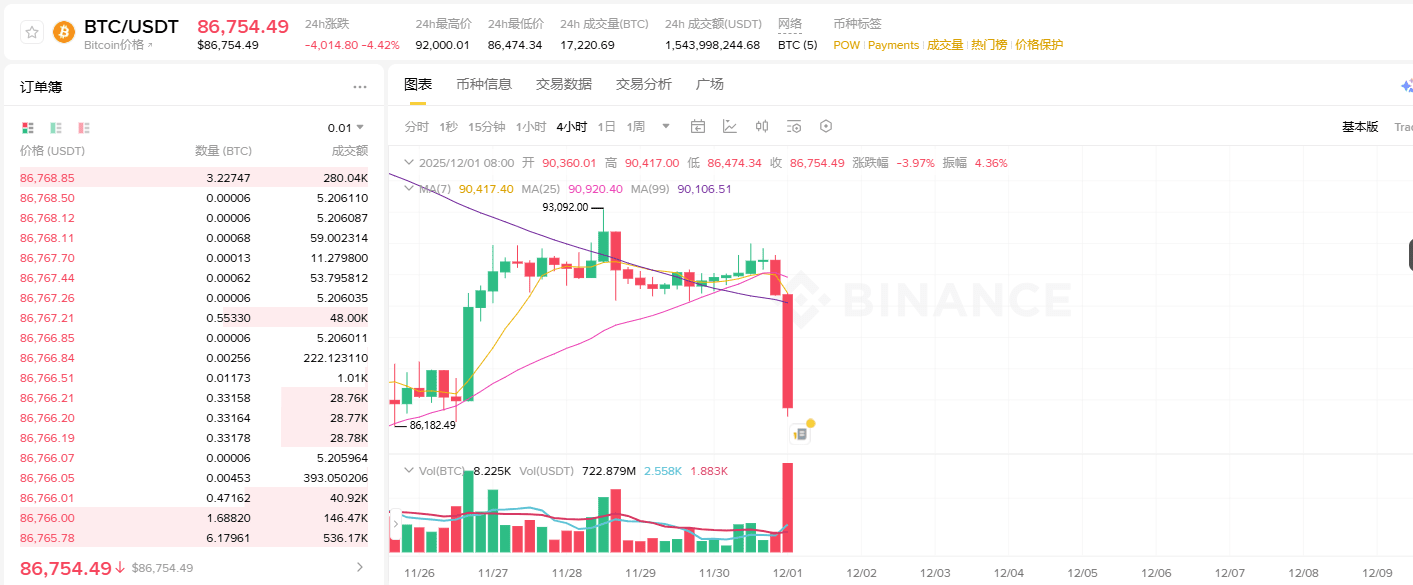 At 8:00 AM Beijing time on December 1st, it should have been a moment to welcome a brand new December, but the market threw a bucket of cold water on everyone. Bitcoin and mainstream currencies suddenly entered a 'free fall' mode at the moment of the monthly close, without any warning.