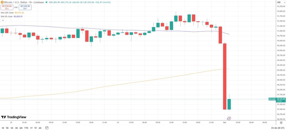 Bitcoin failed to break through a key resistance level over the weekend, and within three hours, it plunged nearly 5%. TradingView data shows that the asset spent most of the weekend fluctuating around $91,500, seemingly preparing for a month-end close, but then suddenly dropped to $86,950 on Coinbase.