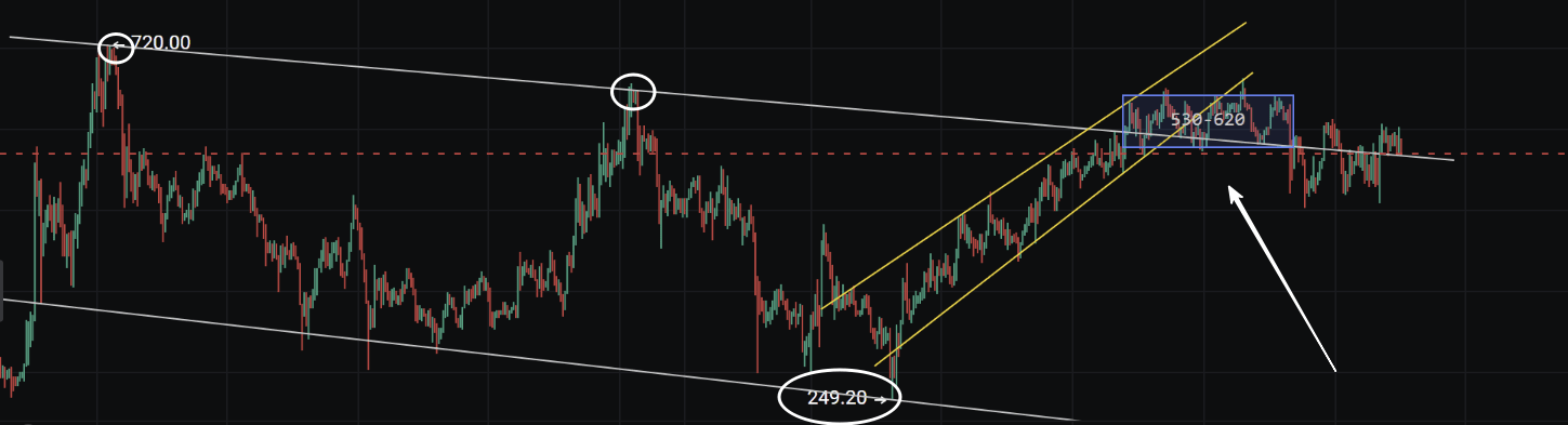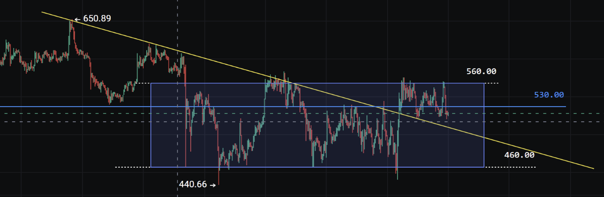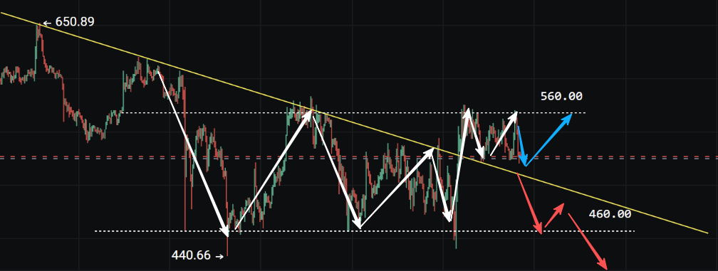 On the 4H level, it started to decline from the high point of 650, creating a downward trend line. At the same time, around the important position of 530, it reformed an oscillation range between 460 and 560.