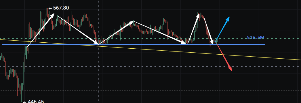On the 1H level, a range of 518-560 has formed with fluctuations (currently just this range). If 518 can withstand the test, it may continue to rise northwards [with a minor resistance around 532 and major resistance around 536]. If it breaks below the 518 support and falls near the yellow trendline at around 500, it may reach near 483.