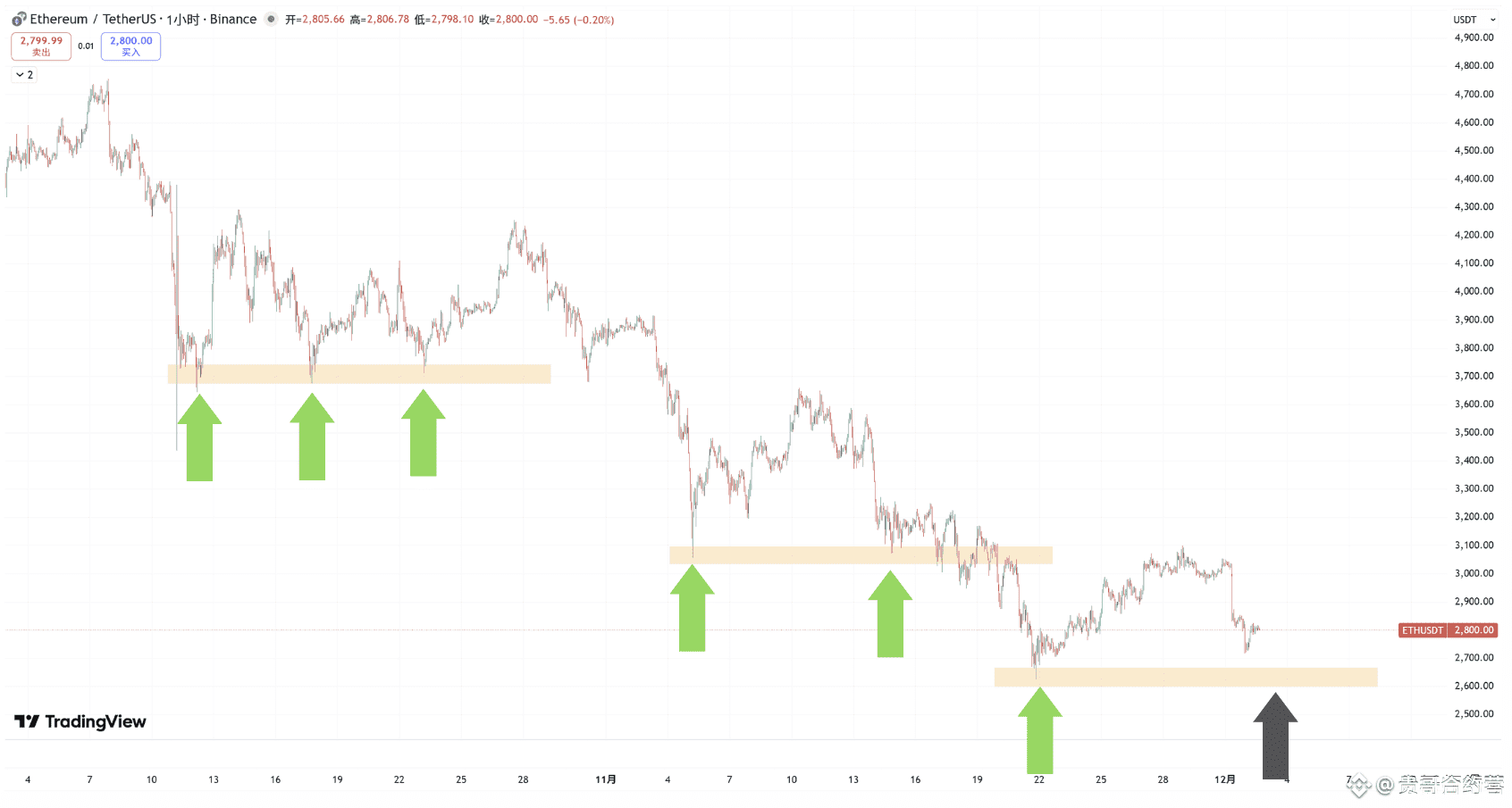 首先是在以太坊(ETH)前期低点附近的区域(大约在2620至2650之间),这里存在较强的支撑力。回顾以往的数据可以发现,每当价格触及这一区间时都会出现5%-10%左右的回升幅度。因此,在这个价位附近寻找反弹的机会具有较高的成功率。虽然我不确定是否会立即行动,但我计划在这个区域内进行尝试,并将持续关注直至降息消息公布为止。