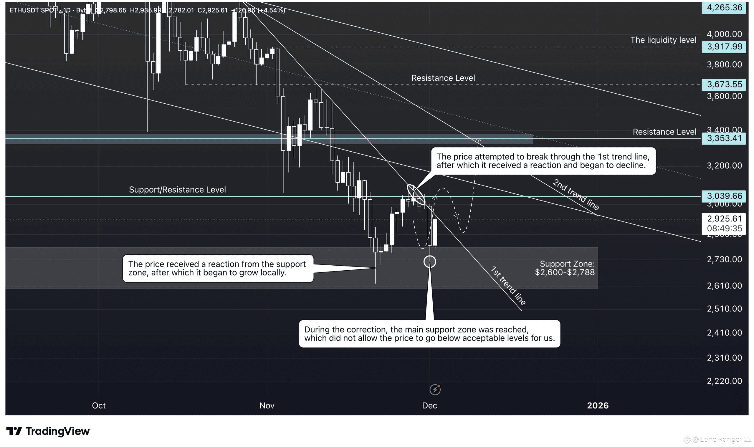 As I expected, the price attempted to break through the 1st trend line, but it did not have enough strength to do so, which is why a corrective movement began During the decline, the asset reached the main support zone ($2,600–$2,788), which prevented the price from falling below the levels acceptable to us.