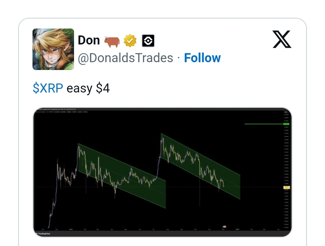 Don considers $4 a simple and conservative milestone, once a breakout occurs. Starting from the current price range around $2.15, this would represent an approximate doubling of value. Other analysts share similar expectations. He anticipates that once XRP exits its consolidation phase, it could advance toward the $4.50 region.