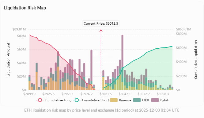 Key resistance: $3,050-$3,100 (dense area of the upper Bollinger band and short liquidations), break above looks to $3,200-$3,220