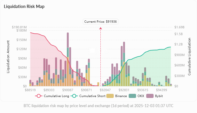 24-hour liquidation data shows extreme differentiation: total liquidations of $174.9 million, among which short liquidations of $160.4 million account for 91.7%, while longs only $14.5 million, confirming that the current rebound is driven by short squeezes. The liquidation dense zone shows accumulation of $1.54 billion long liquidation pressure below $88,519, forming support; while above $94,791, accumulation of $1.12 billion short liquidation forms resistance magnetic absorption effect.