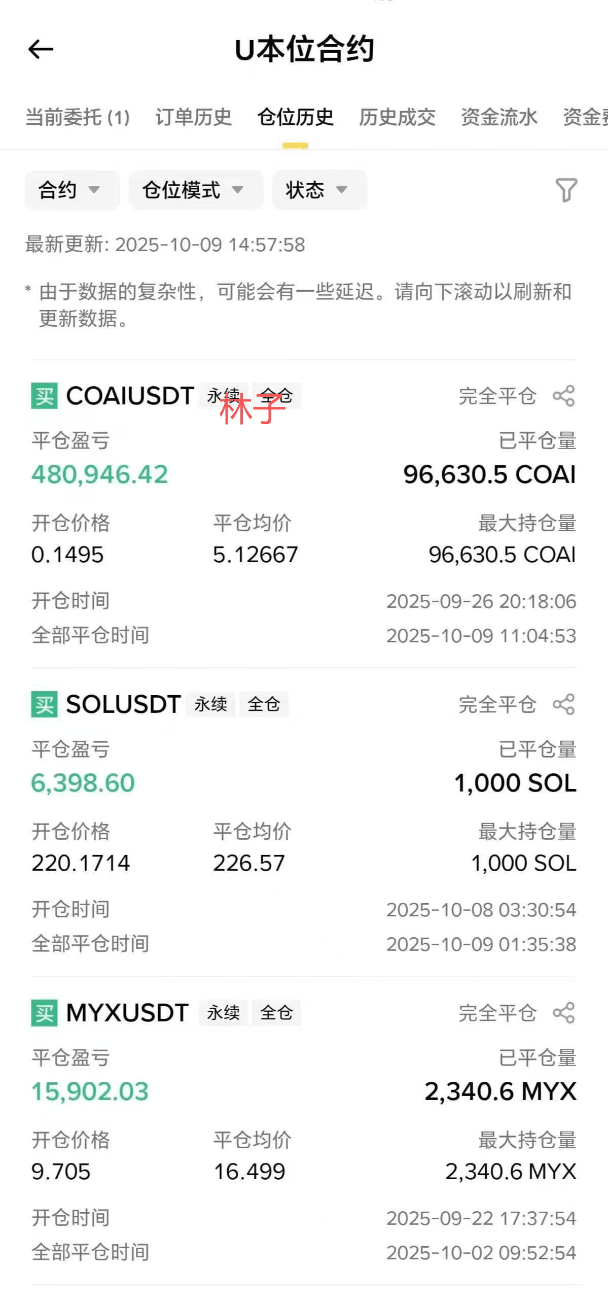 This trade was not accomplished overnight. It experienced severe fluctuations and washouts. The truly critical decision point occurred on October 9th in the morning, when the price rapidly surged above 5.1, and there was a clear momentum reduction and massive turnover in the market. We chose to close all positions, realizing a profit of 480,000 U.