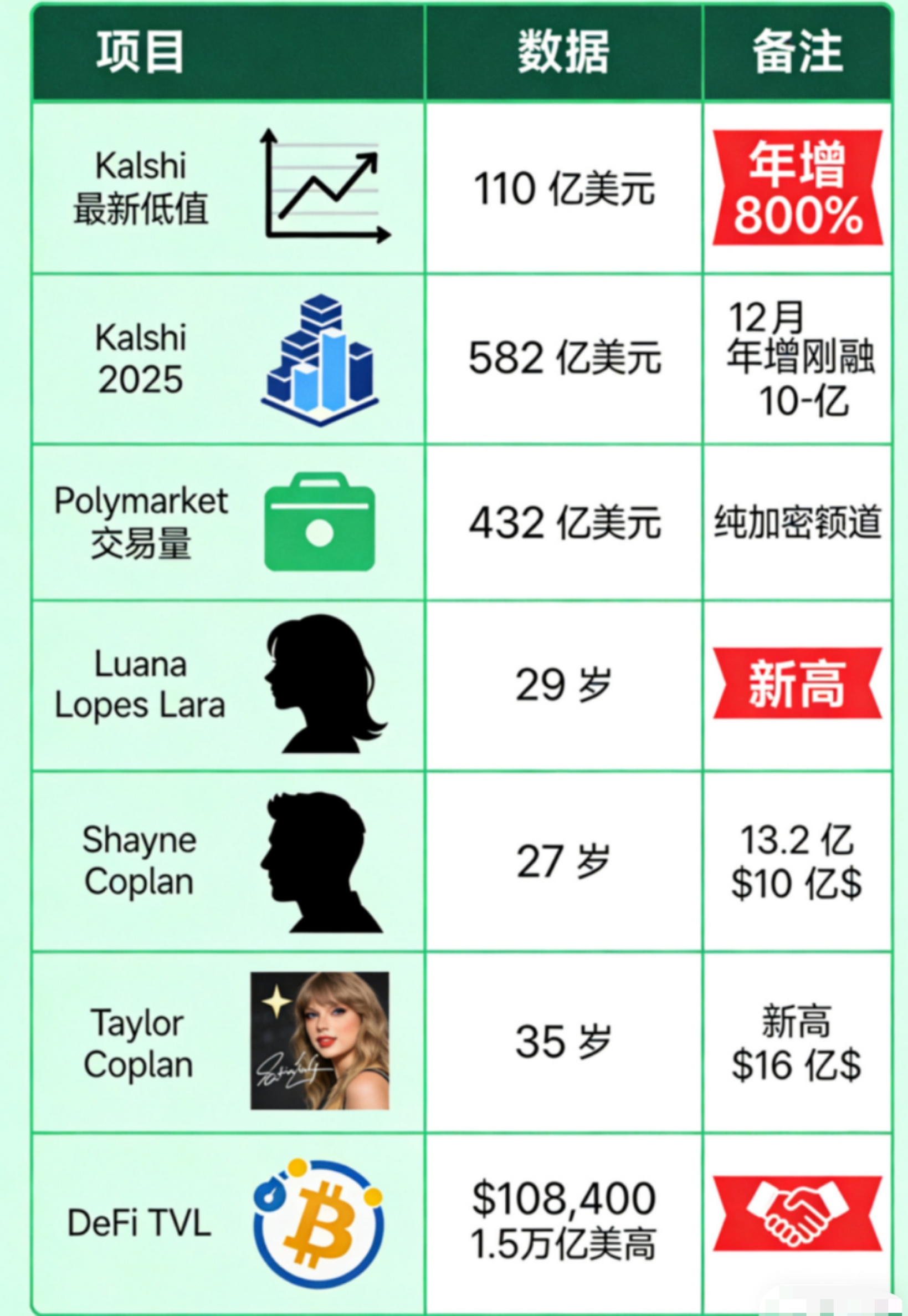 These 'new nobles' largely stem from the intersection of prediction and crypto: Polymarket's trading volume tripled, Kalshi expanded to 140 countries. Market signal +1: Bitcoin breaks $100,000, DeFi TVL exceeds $1 trillion, prediction markets may become the next trillion-dollar sector.