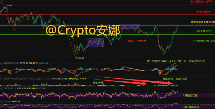 从图上看,BNB现在位于904的多空分水岭上方,MACD的白黄线在0轴上方呈金叉,看似多头强势。但注意啦!RSI和MFI指标都冲进了超买区(RSI高达91.96),这就像一个人跑太快喘不过气,容易摔跤。安娜观点:短期可能会先回调蓄力,再冲高。散户别急着追涨,小心被套在山顶!想知道回调到哪里能接?点关注@南安娜sol ,参与安娜寨民每一次进攻!安娜会在寨里每天公布具体进场时间和实时消息面!