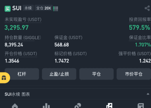 Your current position has not realized a profit of +3,295.97 USDT, with an investment return rate of 579.5%. This is quite a successful position. However, it should be noted that the current price of 1.7472 is significantly far from the opening price of 1.3546, and market volatility may trigger profit-taking, leading to price corrections.