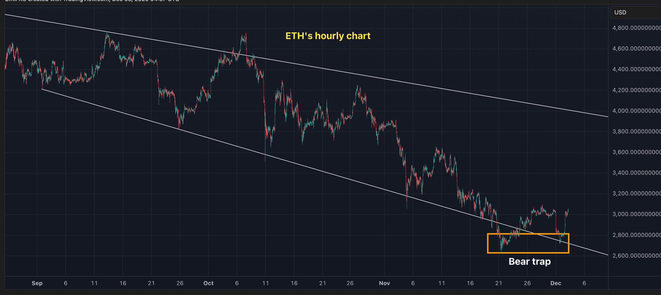 demonstrates a classic bearish trap, where the price action mimics a breakout below the lower boundary of a descending channel before bouncing back.