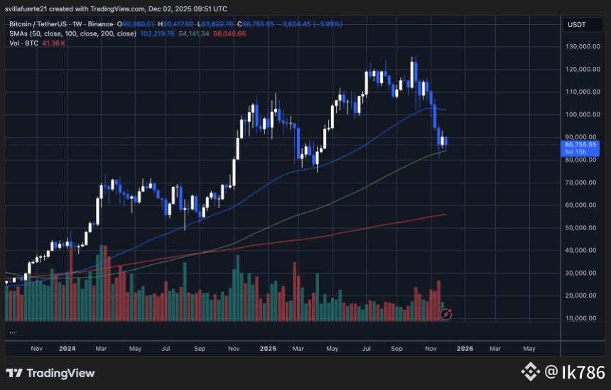 Bitcoin’s weekly chart shows the market pressing into a critical support zone after weeks of heavy selling. The price has dropped from the $115,000 region to the $86,000–$88,000 range, where it now interacts directly with the 100 SMA. This moving average has served as a key structural support in previous cycles, and Bitcoin’s current test of it will likely determine whether the broader uptrend holds or breaks down further.