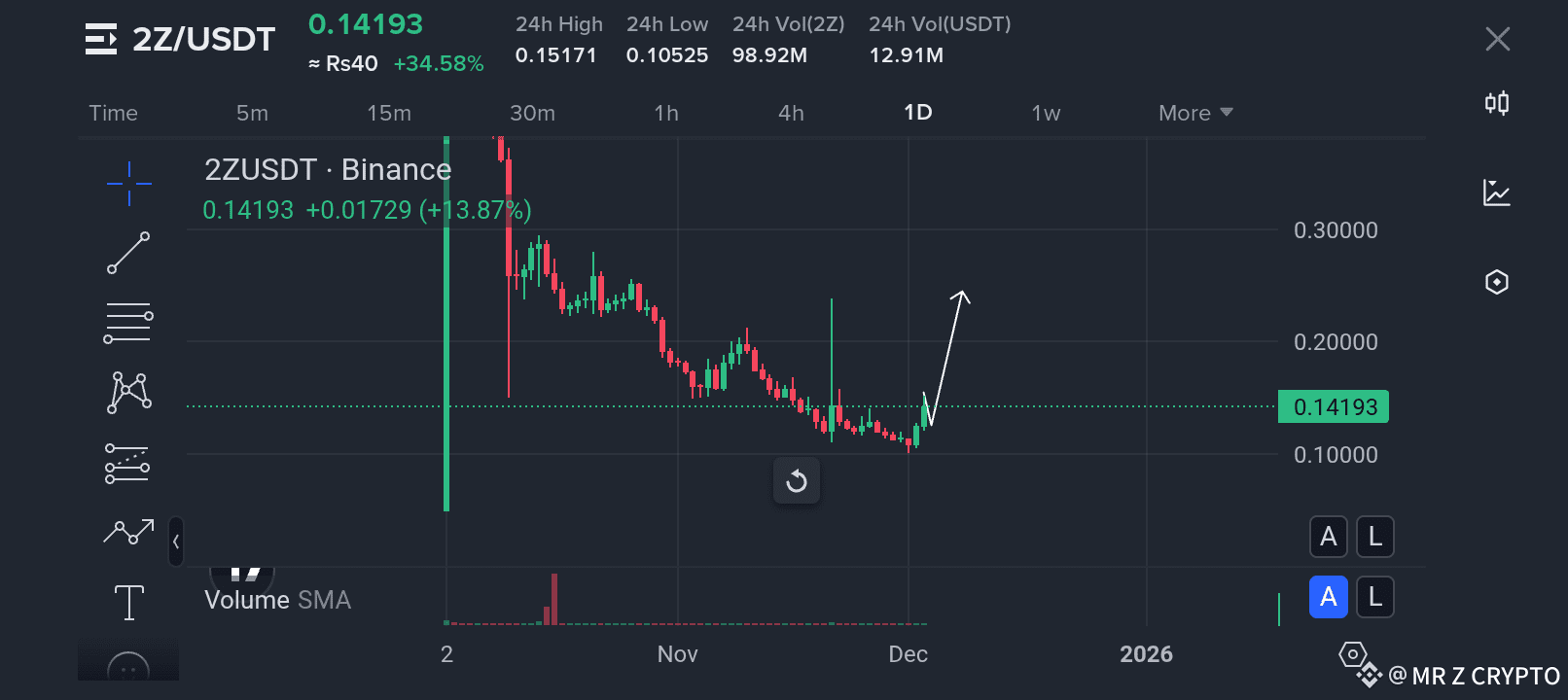 Over the past several days, 2Z has been forming a gradual bottom, and now weโre seeing the first real signs of a trend reversal. Todayโs price movement to 0.14193 (+13.87%) shows that buyers are entering with confidence after an extended downtrend.