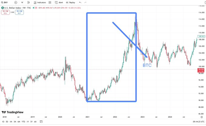 The reason is that crypto is priced in USD; when DXY strengthens, it becomes unprofitable for countries other than USD-based ones to invest in crypto, which is bearish for crypto.