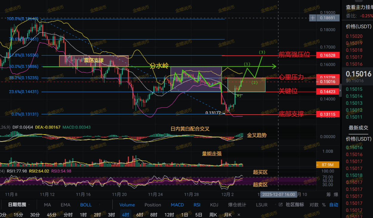 The 4-hour chart shows a 'warming bull market' with MACD golden cross and increasing volume, surging from 0.1344 with strong momentum. However, the hidden risks lie in the details: it is currently stuck at the psychological pressure level of 0.15238; if it breaks, it can touch the previous high of 0.165. But the RSI has already soared into the overbought zone, which means 'the rise is too rapid, and the funds are about to be unable to hold on.'
