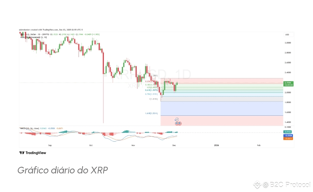 Do ponto de vista técnico, o XRP está tentando se estabilizar acima da faixa de US$ 2,10 a US$ 2,20 após uma correção recente que levou a moeda a uma mínima em torno de US$ 1,82. O preço agora está testando a banda superior da retração de Fibonacci de 1 dia.