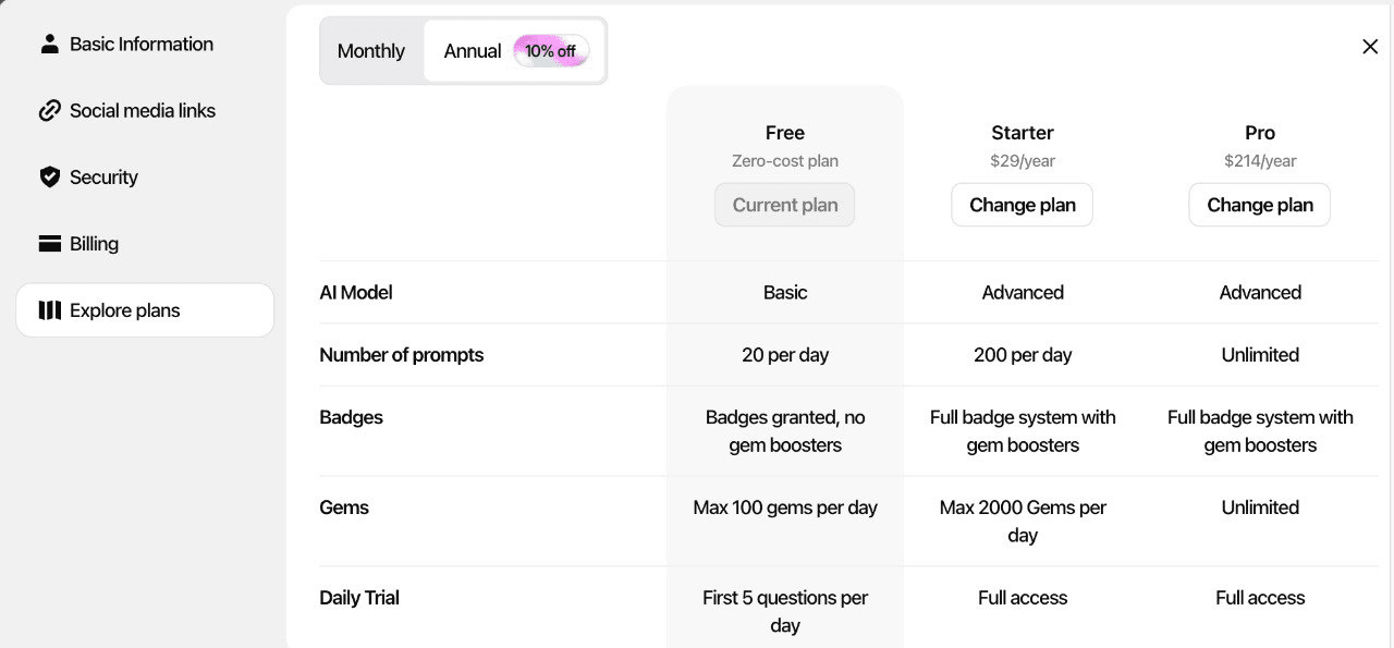 The starter package becomes much more economical with annual payment. The advanced AI model offers a higher question limit and broader analytical coverage.
