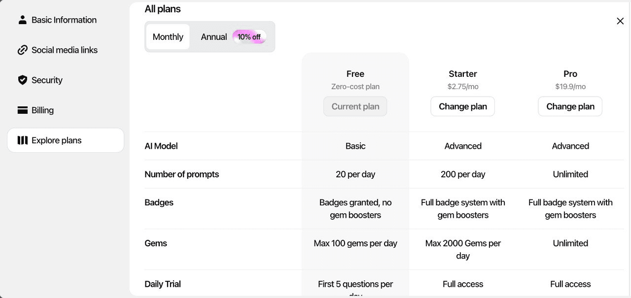 The free plan is sufficient for basic usage scenarios, but the question, gems, and analytical limitations become restrictive over time. It is suitable for those new to crypto or wanting to try Zero Chat.