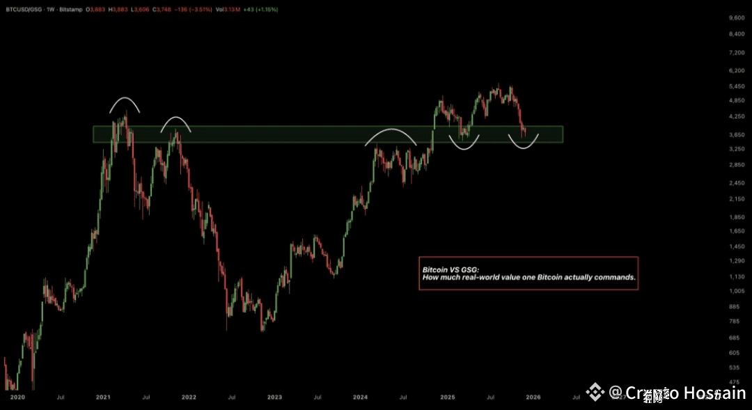 When the ratio hits new highs, one bitcoin buys more actual stuff, oil, copper, wheat, you name it.
