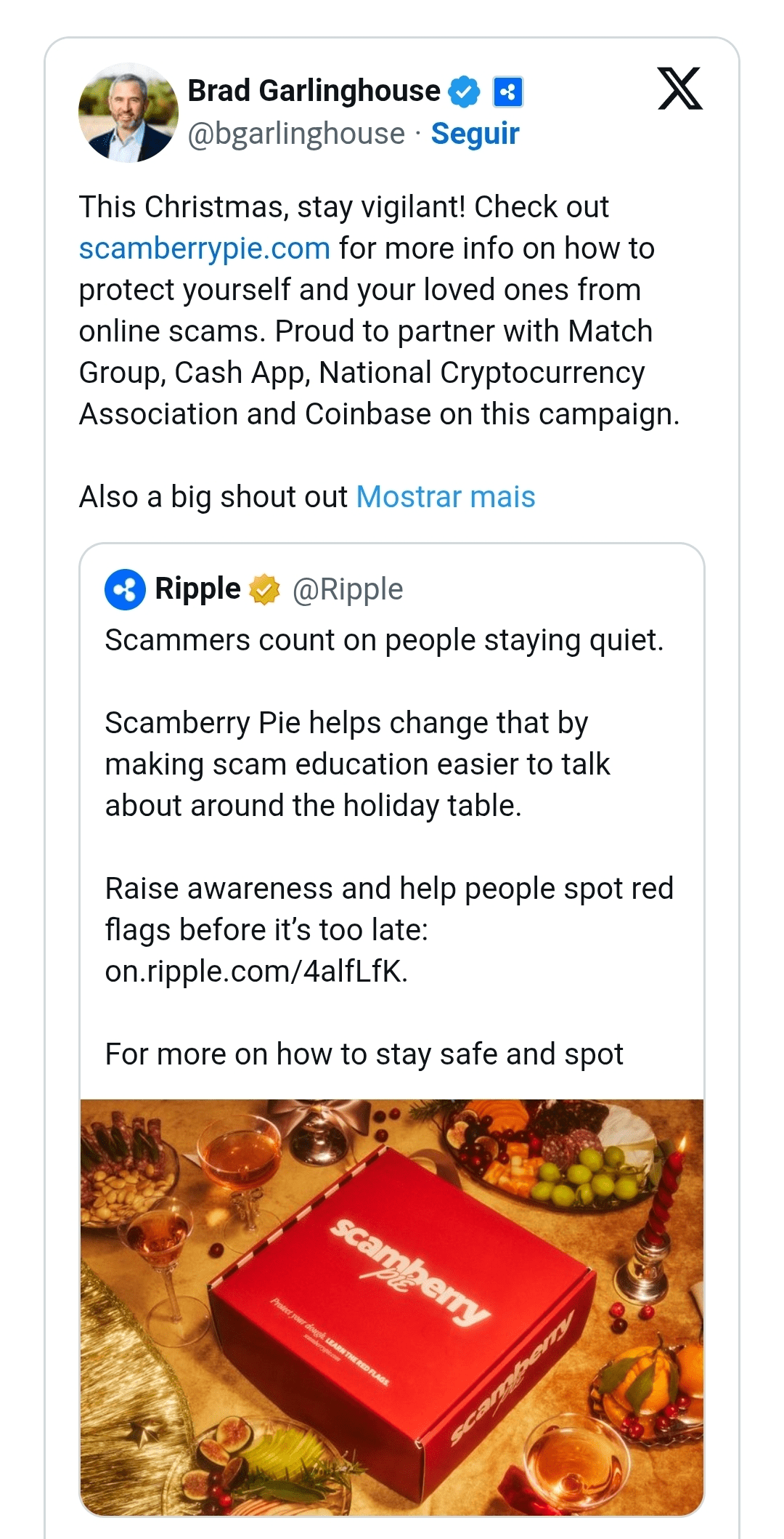 Brad Garlinghouse, CEO of Ripple, joined the campaign with a strong seasonal alert for XRP holders. He urged the community to remain vigilant and visit the website ScamberryPie.com for simple and practical guidance on how to protect themselves from scams.