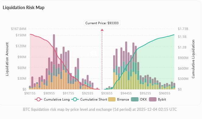 Liquidation cluster risk: cumulative $1.57B long liquidations below $91,000, if support is lost, it may trigger a chain decline.