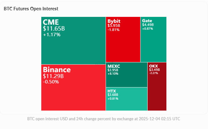Total open interest: $60.03B, 24-hour slight increase +0.21%; among major exchanges, Binance $11.29B (-0.50%), Bybit $5.95B (-1.81%) slightly decreased, showing a slight contraction in leverage exposure.